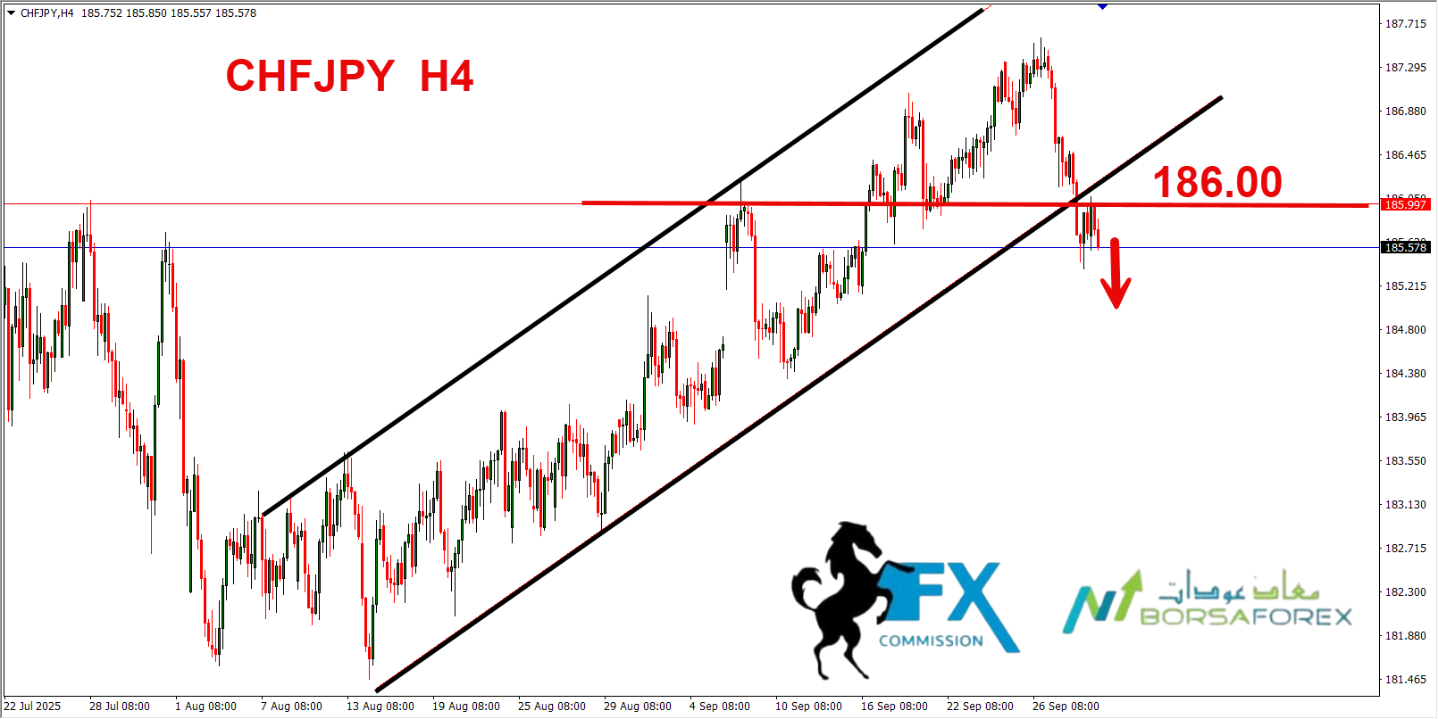 هبوط واضح لسعر الفرنك ين خلال الفترة السابقة، الان قد كسرت مستويات هذه القناة واغلقت اسفلها، في حال بقاء السعر دون مستويات خط المقاومة ومستويات الضلع السفلي للقناة عند أسعار 186.00 والثبات اسفلهم فسيكون هناك فرصة قوية للبيع بأهداف تصل الى 185.10 كهدف أول، اما في حال الصعود واختراق هذه المستويات فالشراء هو الاقرب.